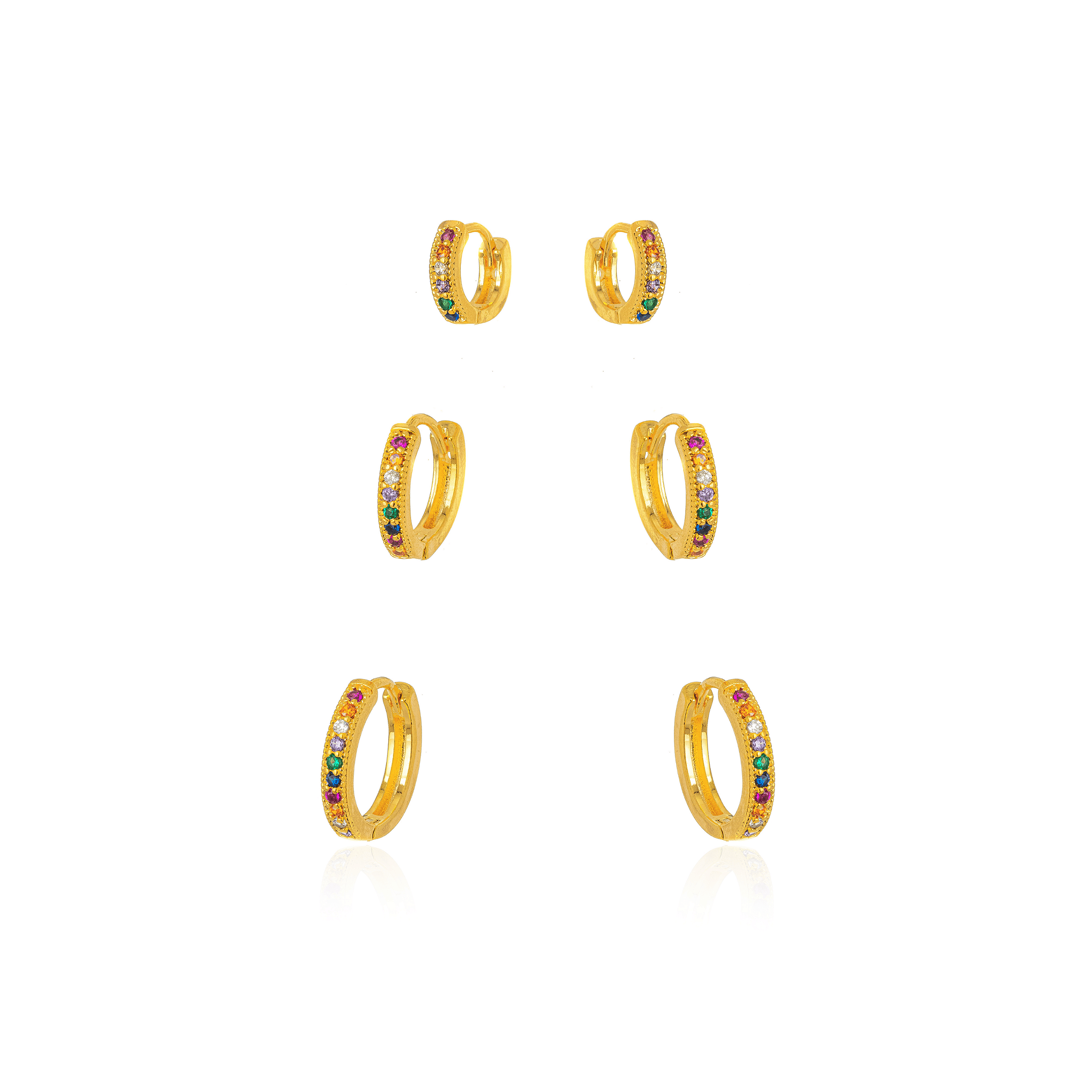 Semijoia Gazin - Brinco Trio Argola Micro Zircônia Color Confeccionado em Banho de Ouro Amarelo 18K.